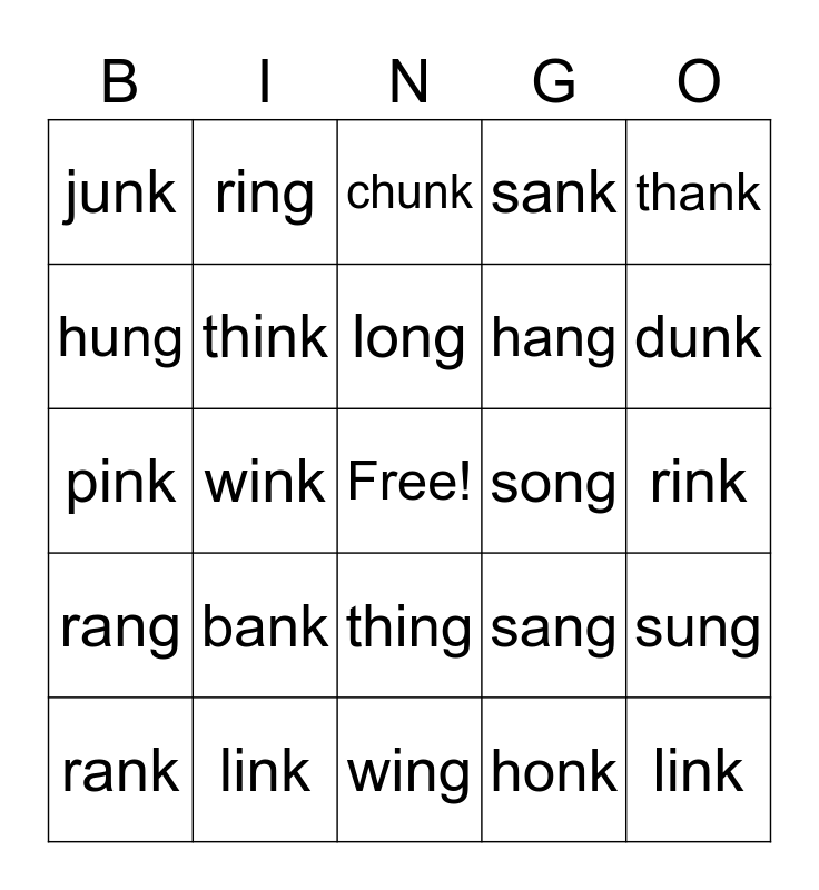 This bingo card has a free space and 24 words: bank, link, long, rank, thank, junk, hung, ring, song, thing, hang, pink, sang, sung, think, honk, rink, chunk, dunk, wink, link, rang, sank and wing.