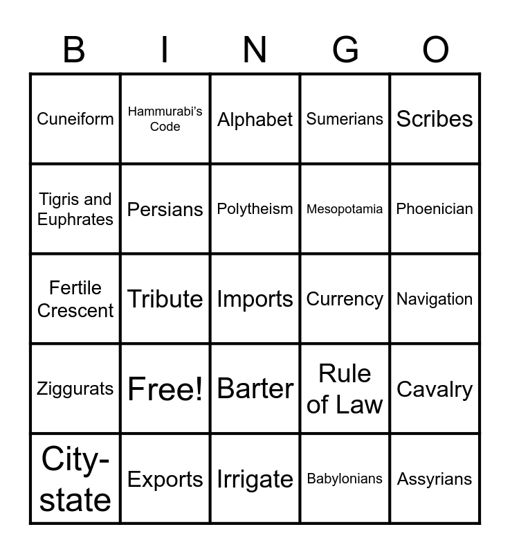 This bingo card has 25 words: Free!, Irrigate, Polytheism, City-state, Scribes, Cuneiform, Tigris and Euphrates, Hammurabi’s Code, Currency, Barter, Mesopotamia, Fertile Crescent, Rule of Law, Cavalry, Persians, Assyrians, Navigation, Alphabet, Phoenician, Tribute, Imports, Exports, Ziggurats, Sumerians and Babylonians.