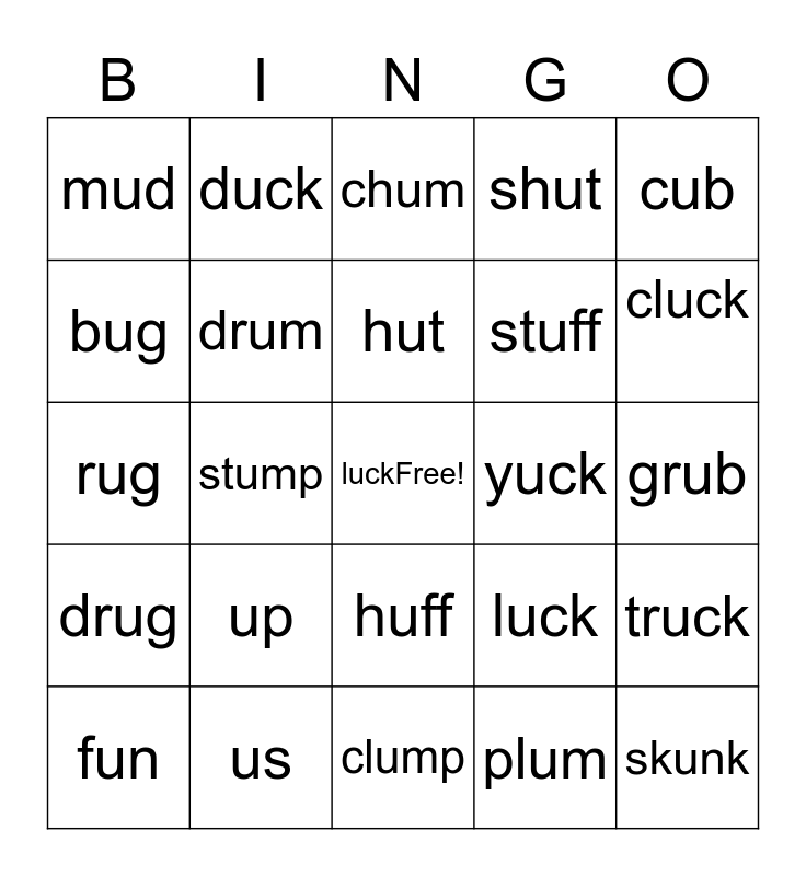 This bingo card has a free space and 24 words: up, us, hut, fun, cub, mud, bug, duck, yuck, huff, stuff, rug, luck, truck, drum, plum, grub, chum, cluck, stump, skunk, drug, shut and clump.