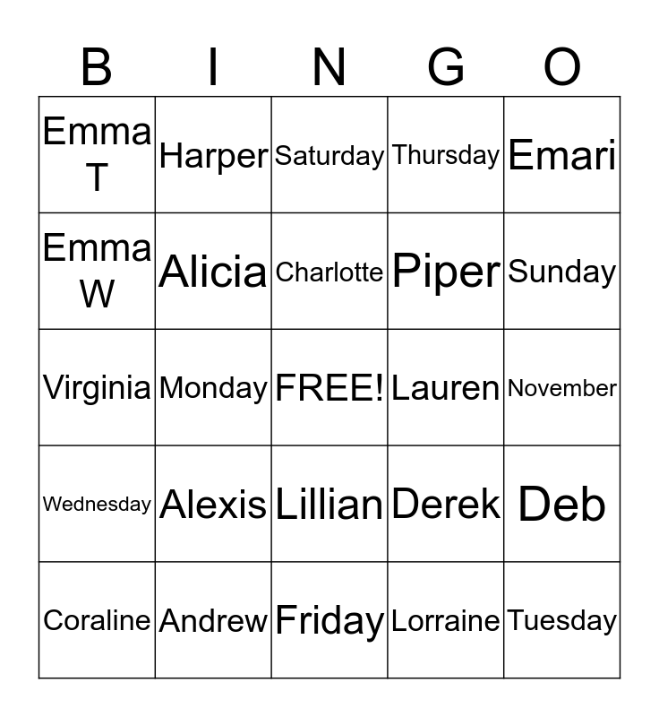 This bingo card has a free space and 24 words: Alexis, Andrew, Charlotte, Coraline, Emari, Emma T, Emma W, Harper, Lauren, Lillian, Piper, Virginia, Derek, Deb, Alicia, Lorraine, November, Saturday, Sunday, Monday, Tuesday, Wednesday, Thursday and Friday.