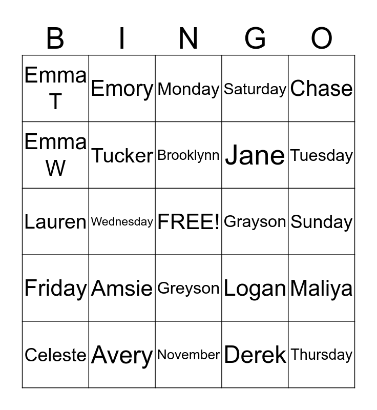 This bingo card has a free space and 24 words: Amsie, Avery, Brooklynn, Celeste, Chase, Emma T, Emma W, Emory, Grayson, Greyson, Jane, Lauren, Logan, Maliya, Tucker, Derek, Sunday, Monday, Tuesday, Wednesday, Thursday, Friday, Saturday and November.