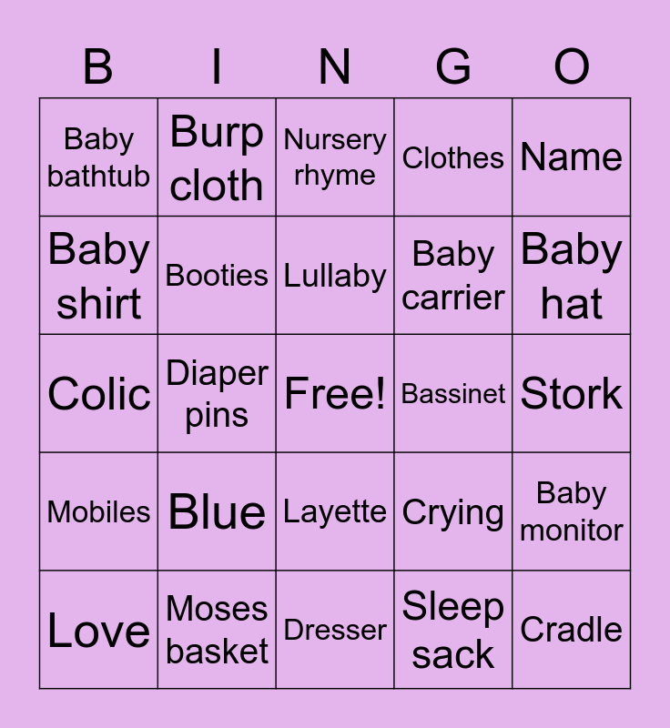 This bingo card has a free space and 92 words: Crib, Cradle, Dresser, High Chair, Bottle, Sippy cup, Baby walker, Love, Diapers, Baby shampoo, Wash cloth, Pink, Ultrasound, Baby carrier, Mittens, Name, Nursery rhyme, Cravings, Grandson, Girl, Nursery, Bath time, Toddler, Baby powder, Blue, Booties, Hooded towel, High chair, Baby socks, Pacifier, Moses basket, Layette, Teether, Granddaugther, Burp cloth, Baby cardigan, Onesie, Carrycot, Lullaby, Crying, Colic, Mobiles, Stork, Security blanket, Cradle, Gifts, Milk, Baby, Diaper bag, Stuffed doll, Formula, Towel, Mommy, Newborn, Baby book, Play gym, Bottle, Baby shirt, Rattle, Diaper pins, Playpen, Wipes, Bib, Gerber, Blankie, Sleep sack, Nap time, Teething ring, Boy, Playsuit, Rubber duck, Baby sling, Clothes, Baby food, Giggles, Family, Baby monitor, Baby lotion, Blanket sleeper, Baby swing, Toy box, Bassinet, Baby bathtub, Stroller, Pram suit, Grandchild, Cot, Teddy bear, Bonnet, Bouncy seat, Baby hat and Blankets.