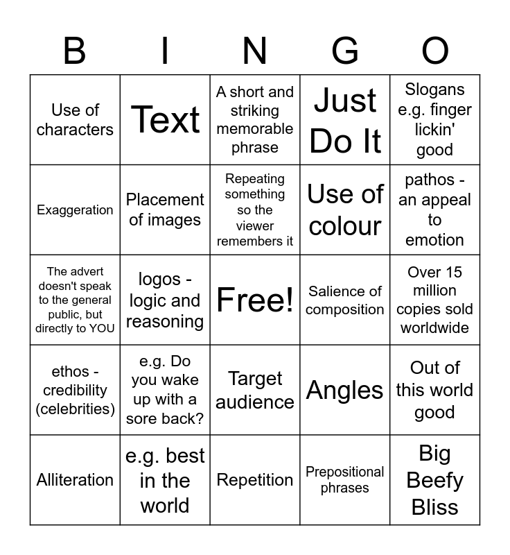This bingo card has a free space and 29 words: Alliteration, e.g. Buy now, collect them all, logos - logic and reasoning, Makes the product sound desirable e.g. juicy apple, Use of characters, A short and striking memorable phrase, Placement of images, e.g. Do you wake up with a sore back?, Salience of composition, e.g. best in the world, Over 15 million copies sold worldwide, Big Beefy Bliss, Repetition, Prepositional phrases, pathos - an appeal to emotion, Distance, Target audience, ethos - credibility (celebrities), Slogans e.g. finger lickin' good, The advert doesn't speak to the general public, but directly to YOU, Angles, Nonsense words e.g. Smiggle, fantabulous, Use of colour, Exaggeration, Just Do It, Text, Out of this world good, Repeating something so the viewer remembers it and 25% daily value of antioxidants & nutrients.
