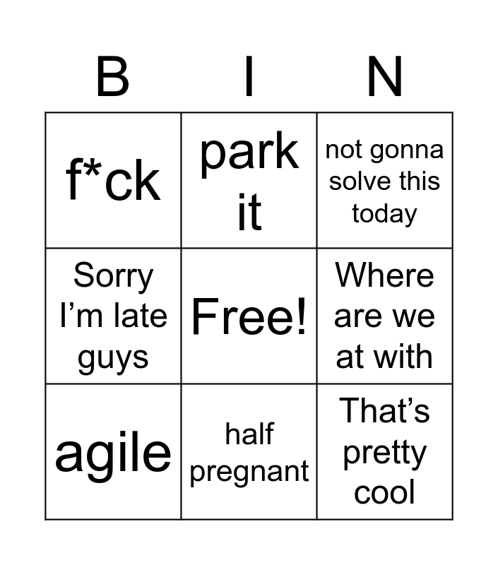 This bingo card has a free space and 21 words: boil the ocean, sh*t, park it, hang on, take that offline, agile, f*ck, not gonna solve this today, it feels to me, half pregnant, stillborn child, Sorry I’m late guys, Can I ask a dumb question, Do we understand the problem, Where are we at with, the process, I’ve got a meeting to go to, My gut feel is, That’s pretty cool, Can you do me a favour and Quickly wrap this up.