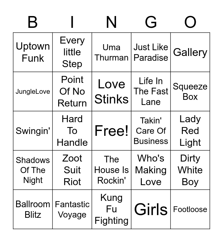 This bingo card has a free space and 65 words: You Dropped A Bomb On Me, We Will Rock You, Freedom, Dirty White Boy, Happy, Bad To The Bone, Every little Step, PYT, Love Stinks, Livin' On A Prayer, The House Is Rockin', September, Lady Red Light, Gallery, I WIsh I Had A Girl, JungleLove, Hard To Handle, Uptown Funk, Everybody Wants You, Life In The Fast Lane, Zoot Suit Riot, Shadows Of The Night, Just Like Paradise, The Lady Is A Tramp, Juiscy Wiggle, Brown Eyed Girl, Respect, Break My Stride, Footloose, Apache (Jump On it), Ballroom Blitz, Rock & Roll Hoochie koo, Cheeseburger In Paradise, Do You Wanna Go Party, Who's Making Love, Fantastic Voyage, 8th Wonder, Swingin', Girls, I Can't Wait, Point Of No Return, Rock Steady, Takin' Care Of Business, Come Together, Pride & Joy, Dance The Night Away, Squeeze Box, Mustang Sally, You Ain't See Nothin' Yet, Fooled Around & Fell In Love, The B**** Is Back, Movin' Out (Anthony's Song), Low Rider, Kung Fu Fighting, California Girls, One Week, Take A Chance On Me, Uma Thurman, Shut Up & Dance, Fireball, Like A G6, Wild Thing, Good Feeling, Cooler Than Me and Party All The Time.