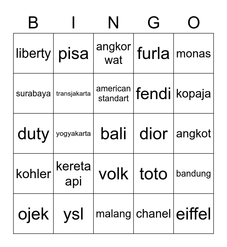 This bingo card has a free space and 24 words: kereta api, ysl, american standart, ojek, monas, liberty, surabaya, pisa, dior, volk, fendi, duty, toto, bandung, transjakarta, chanel, angkot, angkor wat, kopaja, yogyakarta, eiffel, kohler, furla and malang.