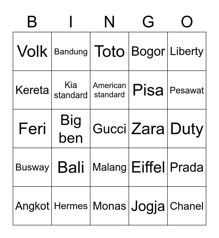 This bingo card has a free space and 24 words: Bali, Hermes, American standard, Angkot, Liberty, Volk, Kereta, Bandung, Zara, Malang, Pisa, Feri, Eiffel, Prada, Kia standard, Jogja, Duty, Toto, Pesawat, Big ben, Chanel, Busway, Bogor and Monas.