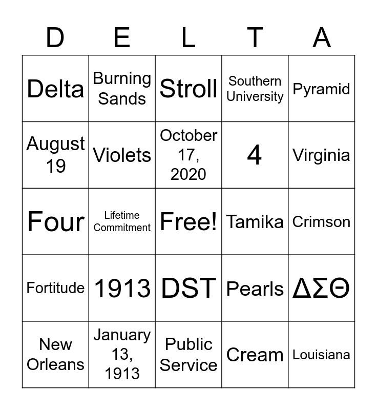 This bingo card has a free space and 29 words: New Orleans, Elephant, Lifetime Commitment, Torch of Wisdom, Delta, Stroll, Violets, 1913, Tamika, January 13, 1913, Crimson, Louisiana, Public Service, Cream, Virginia, FCAC, DST, Fortitude, Pyramid, Four, Pearls, Sisterhood, 4, August 19, Southern University, Burning Sands, ΔΣΘ, October 17, 2020 and Quad.
