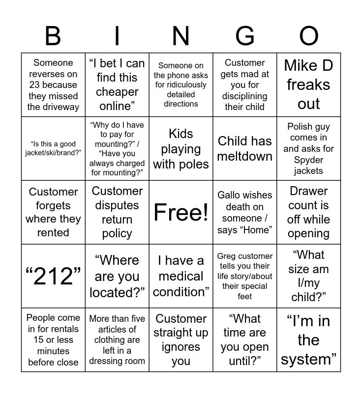 This bingo card has a free space and 53 words: “Do you have a bathroom?”, “I’m in the system”, “I filled out my info last year. Why do I have to do it again?”, “What time are you open until?”, “Where are you located?”, “Why is this so expensive?”, “I bet I can find this cheaper online”, “I’ve been shopping here since you were in Little Falls”, “Is this a good jacket/ski/brand?”, “What size ___ did I buy/rent last year?”, “Why do I have to pay for mounting?” / “Have you always charged for mounting?”, “Is there any discount?” (Bonus if it’s on something ridiculous), “What size am I/my child?”, Greg customer tells you their life story/about their special feet, Customer is surprised they can’t rent poles, People come in for rentals 15 or less minutes before close, Kids playing with poles, Gallo wishes death on someone / says “Home”, It takes more than two attempts for a customer to give the right phone number, Mike D freaks out, Customer disputes return policy, Kids ignore being told not to run, Child has meltdown, Someone reverses on 23 because they missed the driveway, Someone doesn’t understand deposits, More than five articles of clothing are left in a dressing room, Child(ren) plays in rack, Someone sets off emergency door alarm, Veritas messes up rental paperwork, Polish guy comes in and asks for Spyder jackets, Customer mentions they’re getting poles after they’ve already paid for everything, “Are there any coupons?”, “Can I use my security from another location at your store?”, “Do you buy/sell/collect used equipment?”, “Is Greg there?”, Domestic Dispute, Customer gets mad at you for disciplining their child, Customer straight up ignores you, Someone on the phone asks for ridiculously detailed directions, Customer has impossible to understand accent, Customer won't get off phone while being rung out, Will my kids pants from last year fit?, Drawer count is off while opening, “Do I need an appointment to get my skis tuned?”, Customer walks in without a mask, I have a medical condition”, “I forgot my paperwork”, “Are you taking rentals back?”, Customer forgets where they rented, “212”, “When are rentals due?”, Customer doesn’t understand insurance and Someone is hungover.