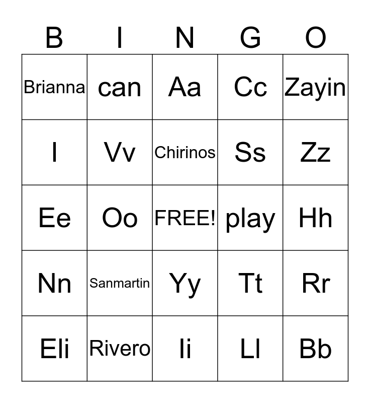 This bingo card has a free space and 24 words: Sanmartin, Rivero, Chirinos, Eli, Zayin, Brianna, I, can, play, Yy, Ss, Ee, Tt, Rr, Vv, Ll, Hh, Aa, Zz, Oo, Bb, Nn, Cc and Ii.