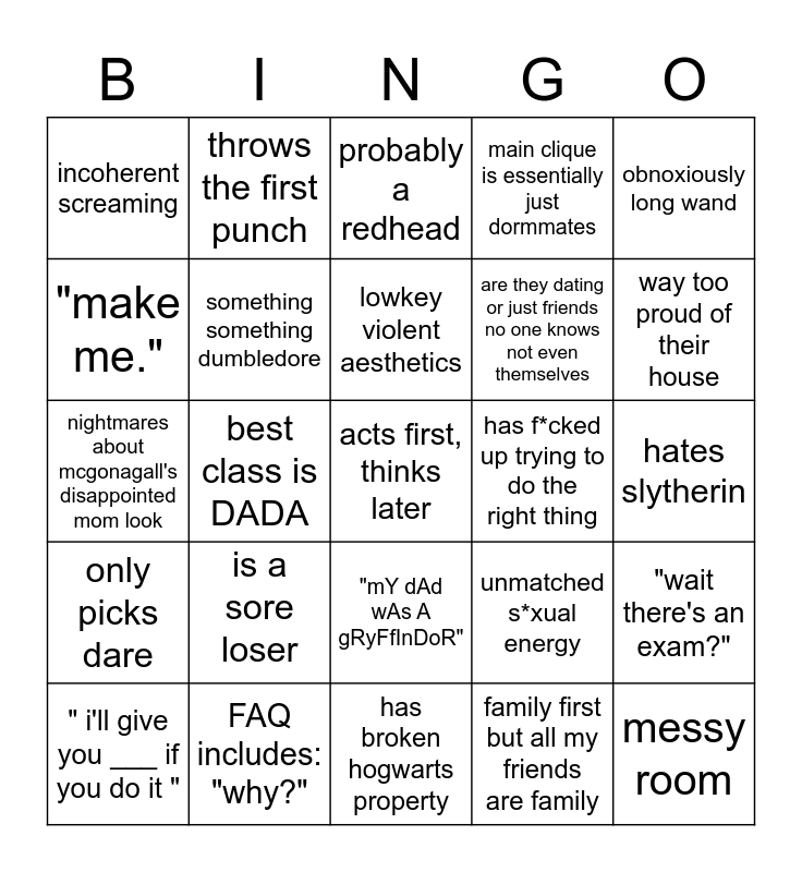This bingo card has a free space and 24 words: " i'll give you ___ if you do it ", is a sore loser, lowkey violent aesthetics, family first but all my friends are family, obnoxiously long wand, incoherent screaming, throws the first punch, probably a redhead, has f*cked up trying to do the right thing, hates slytherin, nightmares about mcgonagall's disappointed mom look, something something dumbledore, unmatched s*xual energy, "wait there's an exam?", "make me.", FAQ includes: "why?", has broken hogwarts property, main clique is essentially just dormmates, way too proud of their house, only picks dare, best class is DADA, "mY dAd wAs A gRyFfInDoR", are they dating or just friends no one knows not even themselves and messy room.