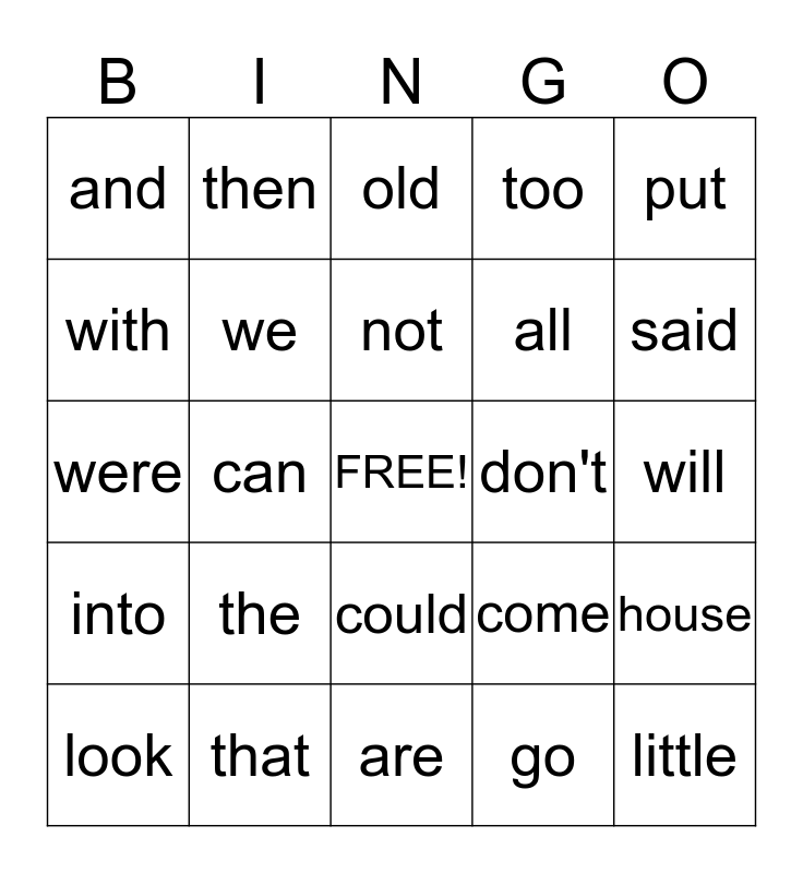 This bingo card has a free space and 24 words: the, that, not, look, put, and, with, then, don't, could, all, were, come, house, we, go, will, old, said, can, little, into, too and are.