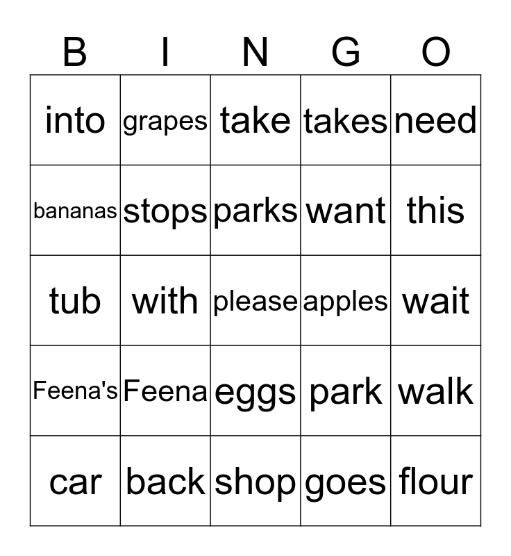 This bingo card has 25 words: Feena, shop, parks, car, need, into, bananas, grapes, apples, eggs, want, tub, park, walk, stops, flour, wait, take, this, with, please, back, Feena's, takes and goes.
