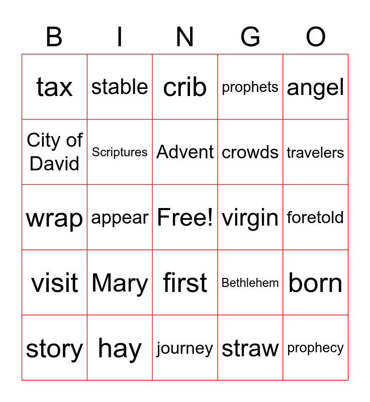 This bingo card has a free space and 39 words: Christmas, Bible, Word, Scriptures, story, first, Advent, nativity, angel, visit, appear, prophets, prophecy, foretold, virgin, Mary, Joseph, tax, Nazareth, Bethlehem, City of David, journey, crowds, travelers, weary, donkey, innkeeper, room, inn, stable, manger, cave, crib, hay, straw, birth, born, wrap and swaddling clothes.