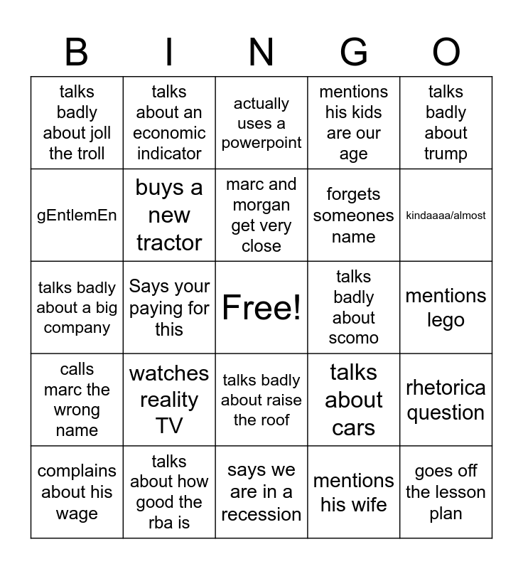 This bingo card has a free space and 29 words: complains about his wage, watching something that makes him angry, Says your paying for this, talks about a tv show, talks badly about joll the troll, actually uses a powerpoint, buys a new tractor, watches reality TV, talks badly about scomo, talks about how good the rba is, mentions lego, goes off the lesson plan, says we are in a recession, mentions his wife, kindaaaa/almost, has a lesson plan, talks badly about raise the roof, calls marc the wrong name, talks badly about trump, talks badly about a big company, talks about cars, hand in pocket and gesture, forgets someones name, gEntlemEn, mentions his kids are our age, talks about an economic indicator, rhetorica question, marc and morgan get very close and has a casual chat not related to class.
