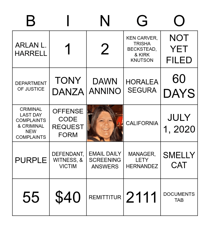 This bingo card has a free space and 38 words: AT CLOSE OF PAY PERIOD, MAIL PAYMENT LOG, RECEIVED STAMP, TONY DANZA, SMELLY CAT, DEFENDANT, WITNESS, & VICTIM, DAWN ANNINO, PROBATE, FAMILY LAW, & CIVIL, NOT YET FILED, HORALEA SEGURA, OFFENSE CODE REQUEST FORM, KEN CARVER, TRISHA BECKSTEAD, & KIRK KNUTSON, DOCUMENTS TAB, JULY 1, 2020, DEPARTMENT OF JUSTICE, PURPLE, NOVEMBER 26, 2020, 2, 1 HOUR, CALIFORNIA, ARLAN L. HARRELL, $40, 60 DAYS, 55, 13 ORIGINAL COLONIES, REMITTITUR, SCANNING DATE, OLIVIA, 7, BILLIE EILISH, BOTTOM, EMAIL DAILY SCREENING ANSWERS, 2111, 1, 4999, MANAGER, LETY HERNANDEZ, CRIMINAL LAST DAY COMPLAINTS & CRIMINAL NEW COMPLAINTS and JUDGE OROZCO.