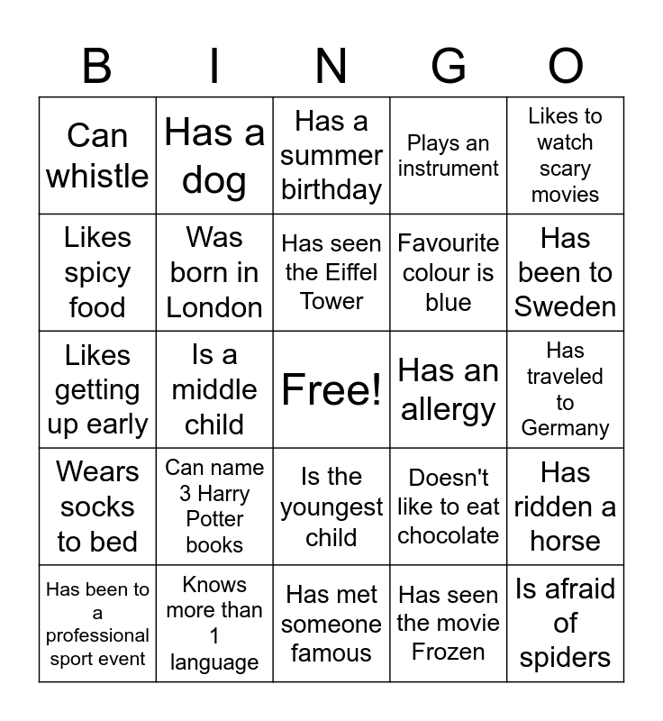 This bingo card has a free space and 24 words: Can name 3 Harry Potter books, Knows more than 1 language, Has seen the Eiffel Tower, Has been to a professional sport event, Likes to watch scary movies, Can whistle, Likes spicy food, Has a dog, Has an allergy, Is the youngest child, Favourite colour is blue, Likes getting up early, Doesn't like to eat chocolate, Has ridden a horse, Was born in London, Has seen the movie Frozen, Has traveled to Germany, Has a summer birthday, Has been to Sweden, Is a middle child, Is afraid of spiders, Wears socks to bed, Plays an instrument and Has met someone famous.