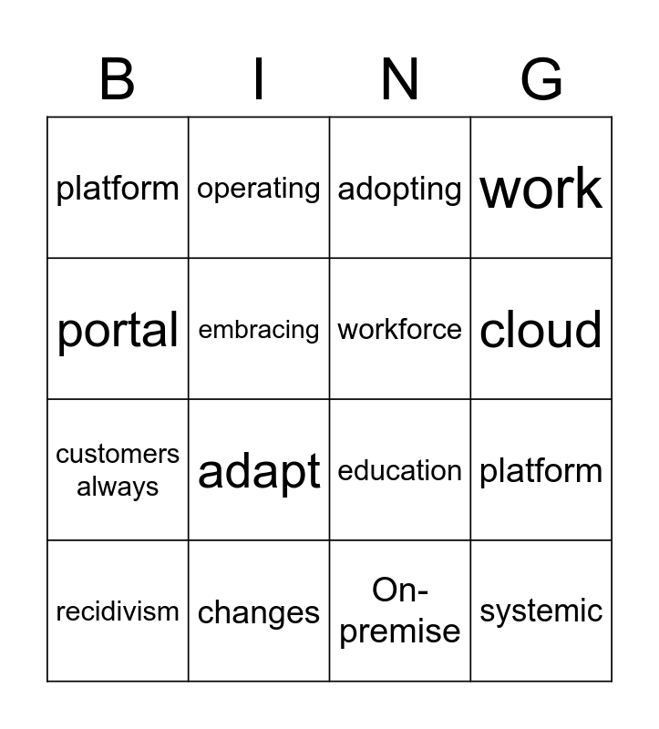 This bingo card has 27 words: Free!, Helping, customers always, action, embracing, adopting, operating, systemic, changes, health, education, work, employees, respond, adapt, accelerate, workforce, cloud, apps, platform, On-premise, off-premise, platform, recidivism, unified, portal and solution.