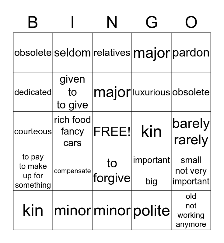 This bingo card has a free space and 24 words: compensate, minor, major, kin, pardon, obsolete, dedicated, seldom, kin, to forgive, luxurious, courteous, important big, small not very important, given to to give, polite, barely rarely, relatives, obsolete, rich food fancy cars, old not working anymore, to pay to make up for something, major and minor.