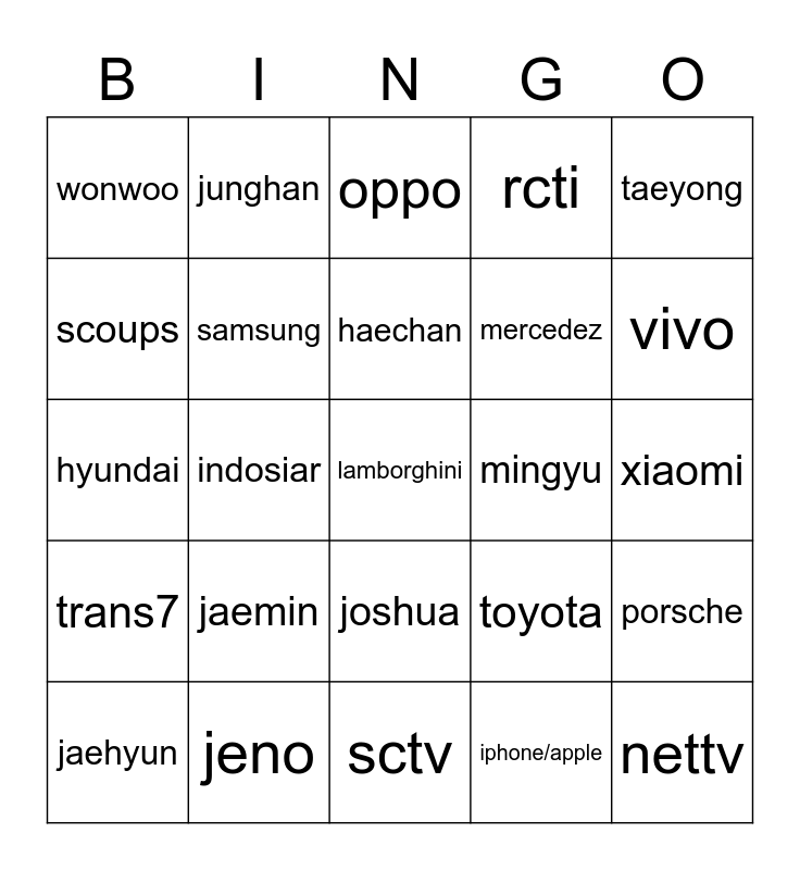 This bingo card has a free space and 24 words: jaemin, jeno, haechan, jaehyun, taeyong, wonwoo, scoups, junghan, mingyu, joshua, mercedez, hyundai, toyota, porsche, samsung, iphone/apple, xiaomi, oppo, vivo, indosiar, nettv, trans7, rcti and sctv.