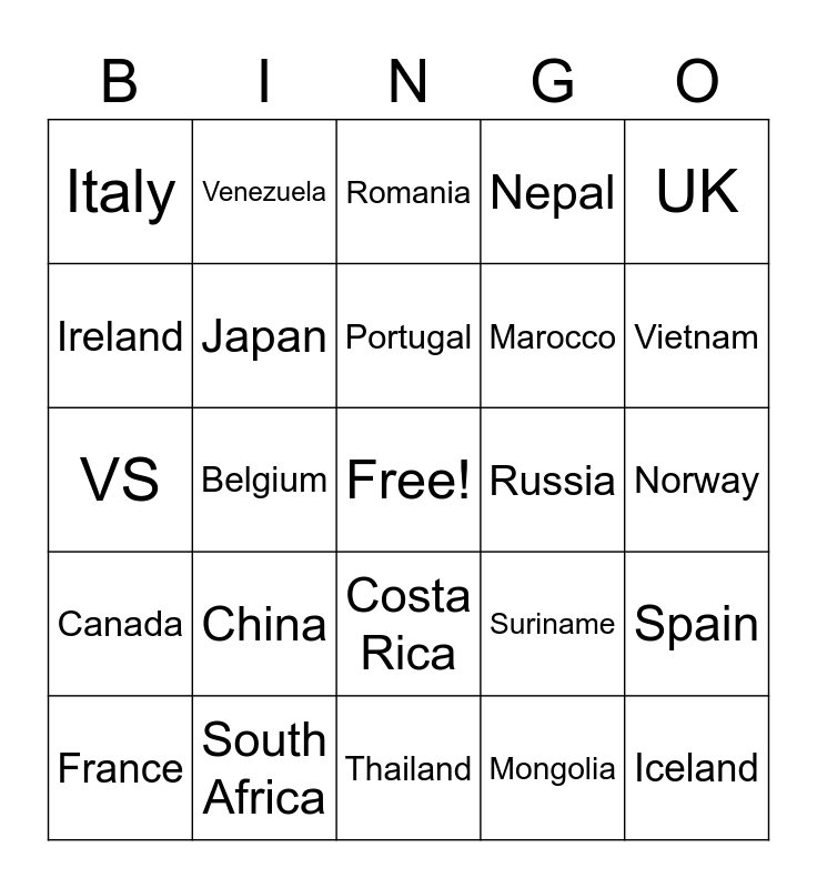 This bingo card has a free space and 29 words: France, Netherlands, Belgium, Germany, Italy, Romania, Japan, China, Russia, South Africa, Norway, Iceland, Thailand, Mongolia, Vietnam, Peru, Costa Rica, Canada, UK, VS, Suriname, Brazil, Marocco, Ireland, Nepal, Venezuela, Spain, Portugal and Croatia.