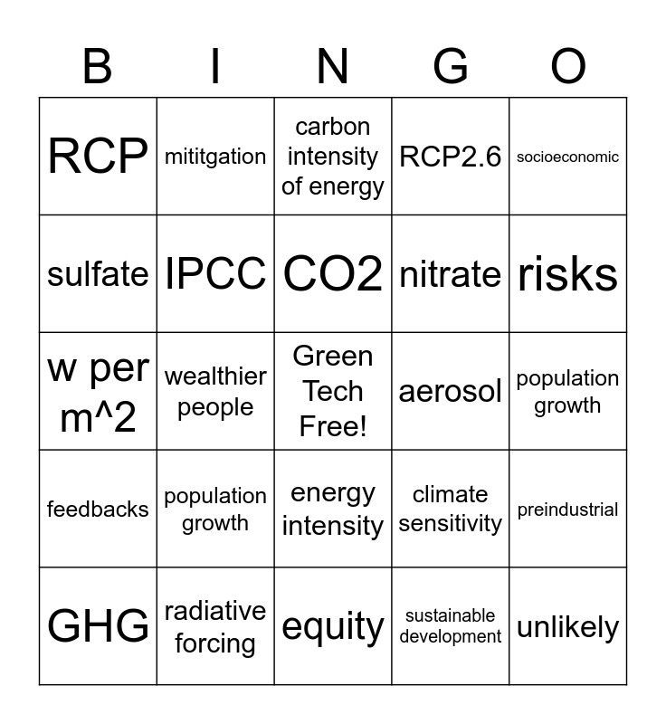This bingo card has a free space and 44 words: CH4, unlikely, emissions, GHG, high confidence, sustainable development, carbon intensity of energy, 2100, socioeconomic, radiative forcing, RCP2.6, aerosol, energy intensity, population growth, RCP8.5, equity, RCP4.5, w per m^2, justice, risks, mititgation, energy intensity, oil, RCP, RCP6.0, population growth, technology, fluxes, climate sensitivity, feedbacks, carbon removal, preindustrial, GDP, alternative futures, wealthier people, overshoot, earth-atmosphere system, N2O, CO2, sulfate, nitrate, Working Group III, IPCC and policy.