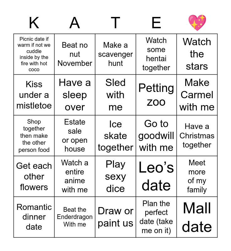 This bingo card has 25 words: Watch a entire anime with me, Draw or paint us, Sled with me, Romantic dinner date, Watch the stars, Picnic date if warm if not we cuddle inside by the fire with hot coco, Kiss under a mistletoe, Beat no nut November, Go to goodwill with me, Play sexy dice, Petting zoo, Shop together then make the other person food, Leo’s date, Meet more of my family, Have a sleep over, Mall date, Have a Christmas together, Make a scavenger hunt, Make Carmel with me, Estate sale or open house, Ice skate together, Beat the Enderdragon With me, Get each other flowers, Watch some hentai together and Plan the perfect date (take me on it).