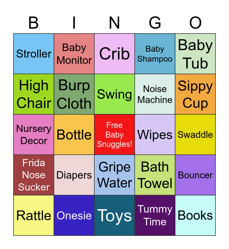 This bingo card has a free space and 29 words: Rattle, Diaper Cream, Bottle, Car Seat, Stroller, Crib, Burp Cloth, Diapers, Wipes, Onesie, Swaddle, Books, Toys, Tummy Time, Sippy Cup, Changing Pad, Gripe Water, Frida Nose Sucker, Baby Tub, Nursery Decor, Bath Towel, Bibs, Noise Machine, High Chair, Baby Shampoo, Baby Monitor, Bouncer, Swing and Teether.