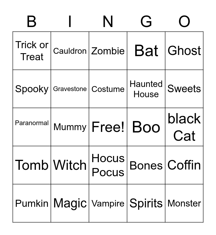This bingo card has a free space and 25 words: Witch, Vampire, Costume, Pumkin, Ghost, Trick or Treat, Spooky, Cauldron, Boo, Hocus Pocus, Haunted House, Paranormal, Bones, Coffin, Gravestone, Broomstick, black Cat, Zombie, Sweets, Mummy, Monster, Magic, Tomb, Bat and Spirits.