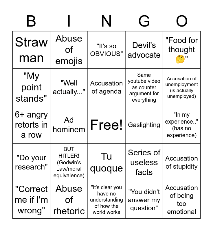 This bingo card has a free space and 24 words: BUT HITLER! (Godwin's Law/moral equivalence), Abuse of rhetoric, Accusation of agenda, "Correct me if I'm wrong", "Food for thought 🤔", Straw man, "My point stands", Abuse of emojis, Gaslighting, Tu quoque, Same youtube video as counter argument for everything, 6+ angry retorts in a row, Series of useless facts, Accusation of stupidity, "Well actually...", "You didn't answer my question", "In my experience.." (has no experience), "It's so OBVIOUS", Accusation of unemployment (is actually unemployed), Ad hominem, Accusation of being too emotional, "Do your research", Devil's advocate and "It's clear you have no understanding of how the world works.