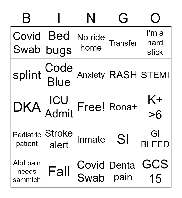 This bingo card has a free space and 24 words: Stroke alert, Fall, Anxiety, Abd pain needs sammich, I'm a hard stick, Covid Swab, splint, Bed bugs, Rona+, Inmate, RASH, DKA, SI, GI BLEED, Code Blue, Dental pain, K+ >6, No ride home, STEMI, ICU Admit, GCS 15, Pediatric patient, Transfer and Covid Swab.