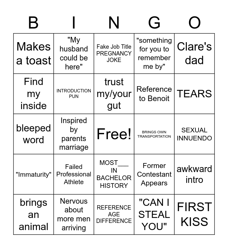 This bingo card has a free space and 30 words: Nervous about more men arriving, "here for the right reasons", Inspired by parents marriage, COVID joke, Makes a toast, Fake Job Title PREGNANCY JOKE, INTRODUCTION PUN, MOST___ IN BACHELOR HISTORY, BRINGS OWN TRANSPORTATION, REFERENCE AGE DIFFERENCE, SEXUAL INNUENDO, FIRST KISS, "CAN I STEAL YOU", "la quinta", TEARS, ELIMINATED B4 ROSE CEREMONY, Former Contestant Appears, "Immaturity", Failed Professional Athlete, Clare's dad, bleeped word, insults juan pablo, "My husband could be here", Reference to Benoit, Find my inside, "something for you to remember me by", awkward intro, brings an animal, trust my/your gut and talks about wanting kids.