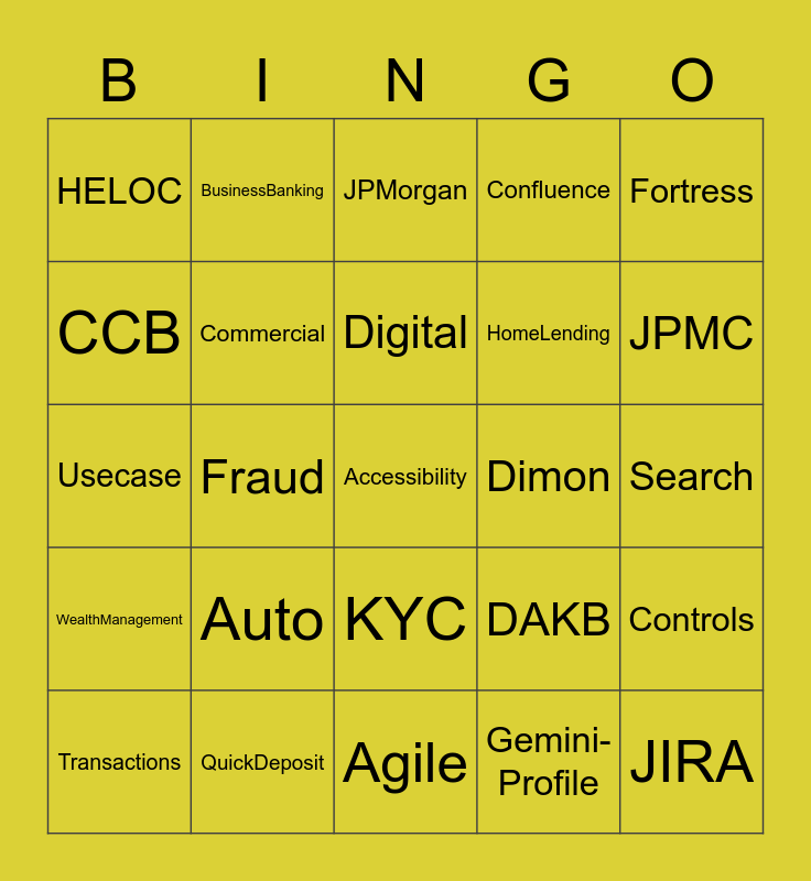This bingo card has 50 words: A11Y, Accessibility, ADA, Agile, Auto, Branch, BusinessBanking, Card, CCB, Chase, Commercial, Confluence, Controls, DAKB, DAO, Development, Digital, Dimon, DTC, Fortress, Fraud, Gemini-Profile, HELOC, HomeLending, Human, JIRA, JPMC, JPMOL, JPMorgan, KYC, LOB, Public, PWS, QA, QuickDeposit, RealEstate, Release, Retail, SCRUM, Search, Secure, Sharepoint, SLT, Spanish, Transactions, Usecase, UserExperience, VOC, WealthManagement and WFH.