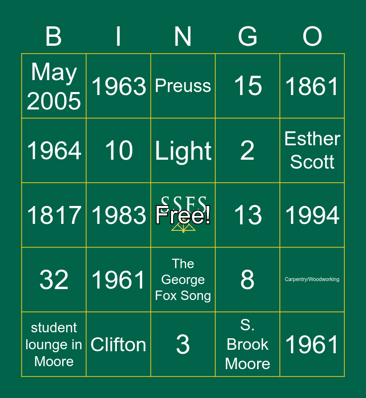 This bingo card has a free space and 42 words: Torch, Light, Wildebeest, 1961, S. Brook Moore, Carpentry/Woodworking, 1961, Baltimore, Preuss, The George Fox Song, 1994, Esther Scott, 1983, 1861, To Kill a Mockinbird, 1996, 8, 77, 1817, 5, 1963, 1964, 2011, 2011, May 2005, 4, 7, 2, 21, 20910, 19, 41, 32, 10, 3, Head of School's residence, student lounge in Moore, Clifton, 13, 83, 17, 15 and 4.