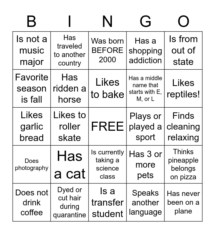 This bingo card has a free space and 24 words: Has a cat, Dyed or cut hair during quarantine, Likes to bake, Does not drink coffee, Is from out of state, Is not a music major, Favorite season is fall, Has traveled to another country, Plays or played a sport, Is currently taking a science class, Has a middle name that starts with E, M, or L, Likes garlic bread, Has 3 or more pets, Thinks pineapple belongs on pizza, Has ridden a horse, Speaks another language, Finds cleaning relaxing, Was born BEFORE 2000, Likes reptiles!, Likes to roller skate, Has never been on a plane, Does photography, Has a shopping addiction and Is a transfer student.
