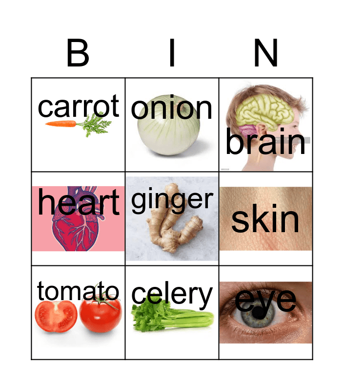 This bingo card has 15 images and 15 words: beans, bones, brain, carrot, celery, ginger, kidneys, lungs, skin, eye, grapes, heart, tomato, onion and walnut.