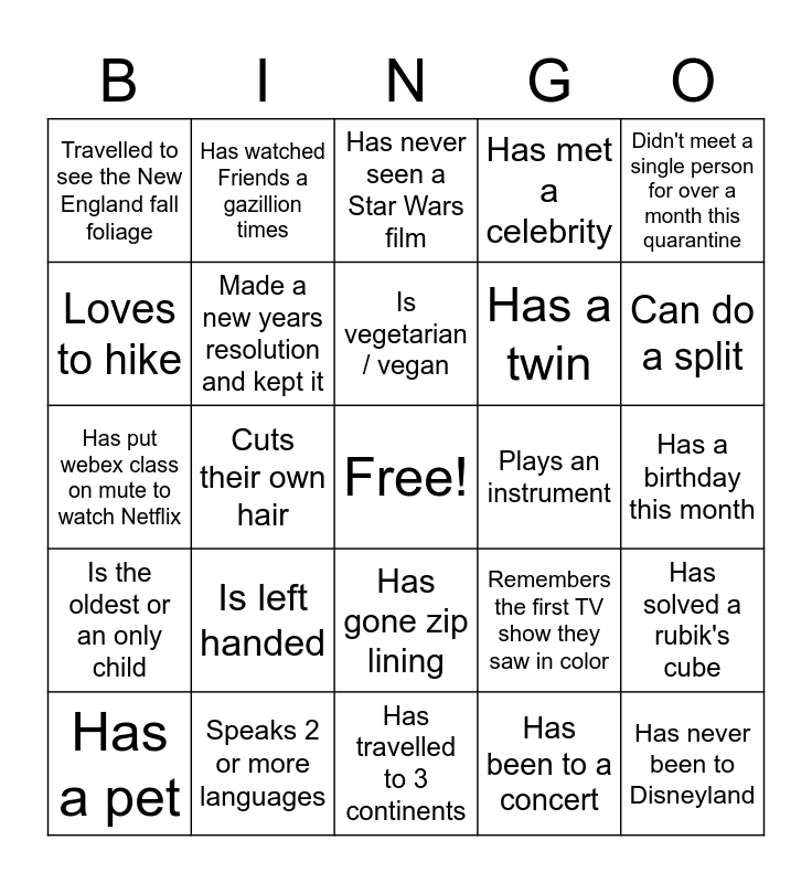 This bingo card has a free space and 24 words: Is left handed, Speaks 2 or more languages, Is vegetarian / vegan, Has a pet, Didn't meet a single person for over a month this quarantine, Travelled to see the New England fall foliage, Loves to hike, Has watched Friends a gazillion times, Plays an instrument, Has gone zip lining, Has a twin, Has put webex class on mute to watch Netflix, Remembers the first TV show they saw in color, Has solved a rubik's cube, Made a new years resolution and kept it, Has been to a concert, Has a birthday this month, Has never seen a Star Wars film, Can do a split, Cuts their own hair, Has never been to Disneyland, Is the oldest or an only child, Has met a celebrity and Has travelled to 3 continents.