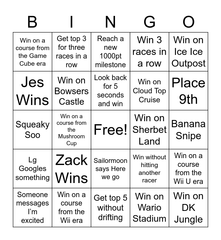 This bingo card has a free space and 150 words: Win on Mariokart Stadium, Win on Water Park, Win on Sweet Sweet Canyon, Win on Thwomp Ruins, Win on Mario Circuit 8, Win on Toads Harbor, Win on Twisted Mansion, Win on Shy Guy Falls, Win on Shine Airport, Win on Dolphin Shoals, Win on Electrodrome, Win on Mount Wario, Win on Cloud Top Cruise, Win on Bone Dry Dunes, Win on Bowsers Castle, Win on Rainbow 8, Win on Donut Plains, Win on Rainbow SNES, Win on Toads Turnpike, Win on Royal Raceway, Win on Yoshi Valley, Win on Rainbow 64, Win on Mario Circuit GBA, Win on Cheese Land, Win on Ribbon Road, Win on Dry Dry Desert, Win on Baby Park, Win on Sherbet Land, Win on Yoshi Circuit, Win on Cheep Cheep Beach, Win on Wario Stadium, Win on Tick Tock Clock, Win on Moo Moo Meadows, Win on Wario Gold Mine, Win on Grumble Volcano, Win on Music Park, Win on Piranha Plant Slide, Win on Neo Bowser City, Win on DK Jungle, Win on Dragon Driftway, Win on Wild Woods, Win on Super Bellway, Win on Ice Ice Outpost, Win on Animal Crossing, Win on Hyrule Circuit, Win on Excite Bike, Win on Mute City, Win on Big Blue, Lg Googles something, Cheesy gives a thank you speech, Sailormoon says IKR, Sailormoon says Here we go, Squeaky Soo, Someone says OMG, Chessy says priority, Shadow becomes someone else’s character, Cheesy Wins, Soo Yun Wins, Shadow Wins, Nick Wins, Lg Wins, Zack Wins, Jes Wins, Snow Dog Wins, Cheesy Squad gets top 3, Win 3 races in a row, Get top 3 for three races in a row, Get 7th three times in a row, Win without using items, Get top 5 without drifting, Win without hitting another racer, Fall off 3 times and win, Attack three different CS members and win,, Blow your engine and win,, Start in last on the final lap and win,, Shock dodge and win,, Have your points end on 69,, The CS Squad gets top 3,, Look back for 5 seconds and win, Get hit by 2 blue shells and win,, ZZ Wins, Big Nasty Wins, Slim Shady Wins, Win with zero coins, Banana Snipe, Green Shell Snipe, Nick says take me to the promised land, Someone says Sus, Someone says double first, AJ wins, Smurphy wins, Kanitha aka Endless wins, Donger Wins, Get top 3 without using items, Win while using a different character, Win while using a different vehicle, Someone mentions food,, Someone mentions a beverage, Don’t use items for one lap and win, Win while using different wheels, Place 12th, Place 11th, Place 10th, Place 9th, Place 8th, Place 7th, Place 6th, Place 5th, Place 4th, Place 3rd, Place 2nd, Hit 3 ppl with triple reds, Hit 3 ppl with triple greens, Land a bomb snipe, Win with the Mercedes Bins, Hit 3 ppl with a boomerang, Have you points end in 99, Reach a new 1000pt milestone, Compliment the person that got 5th, Win on a course from the SNES era, Win on a course from the N64 era, Win on a course from the GBA era, Win on a course from the DS era, Win on a course from the Game Cube era, Win on a course from the Wii era, Win on a course from the 3DS era, Win on a course from the Wii U era, Win on a course from the Mushroom Cup, Win on a course from the Flower Cup, Win on a course from the Star Cup, Win on a course from the Special Cup, Someone messages Hello, Someone messages UnFair, Someone messages I’m using tilt controls, Someone messages What a Shame, Someone messages Hooray, Someone messages Let’s wait for more players, Someone messages I’m excited, Someone messages Goodnight, Someone messages I’m a little nervous, Finish with 1 coin, Finish with 2 coins, Finish with 3 coins, Finish with 4 coins, Finish with 5 coins, Finish with 6 coins, Finish with 7 coins, Finish with 8 coins, Finish with 9 coins and Finish with 10 coins.
