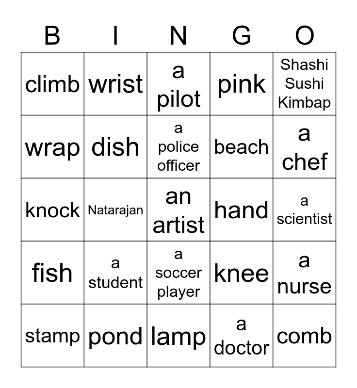 This bingo card has 42 words: a firefighter, a police officer, a teacher, a student, a doctor, a nurse, an artist, a singer, a pilot, a soccer player, a scientist, a chef, Natarajan, Shashi Sushi Kimbap, Sophia Tr., knee, write, knock, knit, wrist, wrap, lamb, comb, climb, lunch, peach, beach, teeth, mouth, bath, wash, fish, dish, lamp, jump, stamp, pond, hand, wind, bank, pink and wink.