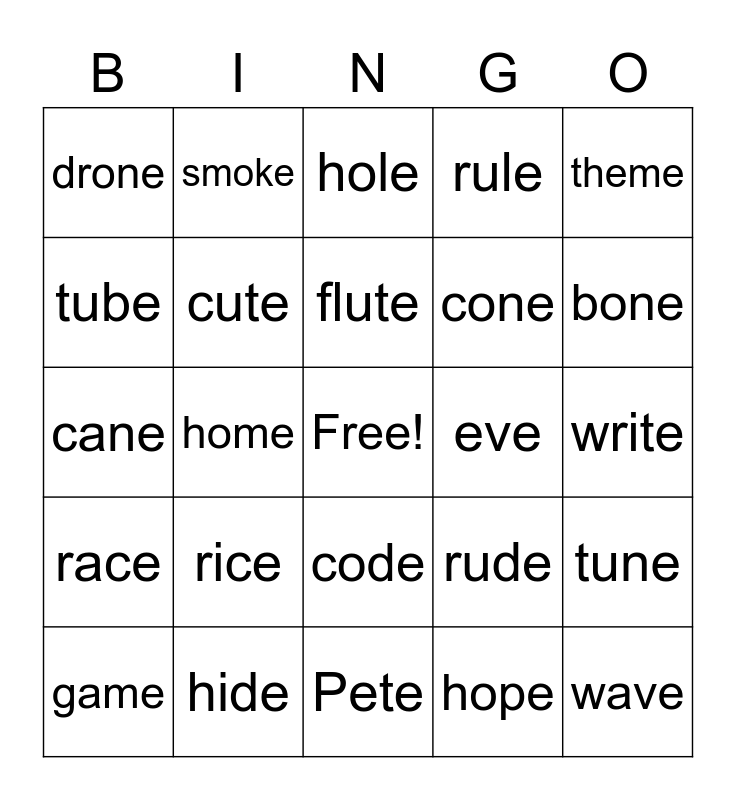 This bingo card has a free space and 50 words: state, wave, cage, Pete, rice, time, smoke, phone, tube, dune, cute, rule, tune, rude, cube, huge, flute, eve, here, theme, home, hope, drone, cone, robe, note, bone, joke, hole, code, bite, ride, hike, kite, hide, dime, slide, shine, smile, write, tape, bake, cape, hate, game, cane, vase, rake, race and face.