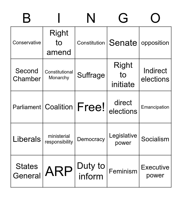 This bingo card has a free space and 30 words: ARP, Cabinet, Coalition, Confessionalism, Conservative, Constitution, Constitutional Monarchy, Democracy, direct elections, Duty to inform, Emancipation, Executive power, Feminism, Head of state, Indirect elections, Inviolable, Legislative power, Liberals, ministerial responsibility, opposition, Parliament, Prime Minister, Right to amend, Right to initiate, Second Chamber, Senate, Socialism, States General, Suffrage and Universal suffrage.