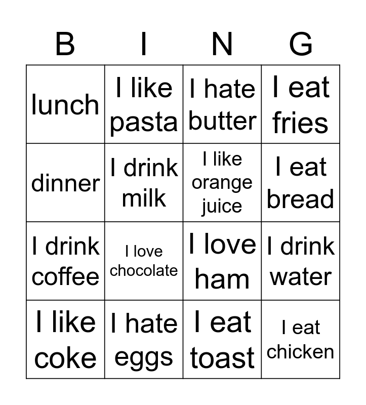 This bingo card has 24 words: Free!, I love cheese, I eat bread, breakfast, dinner, lunch, I drink milk, I like pasta, I hate eggs, I eat cereal, I drink coffee, I love ham, I like pizza, I hate coffee, I like orange juice, I eat a hamburger, I eat toast, I hate butter, I love chocolate, I drink water, I like coke, I eat chicken, I eat fries and I like salad.
