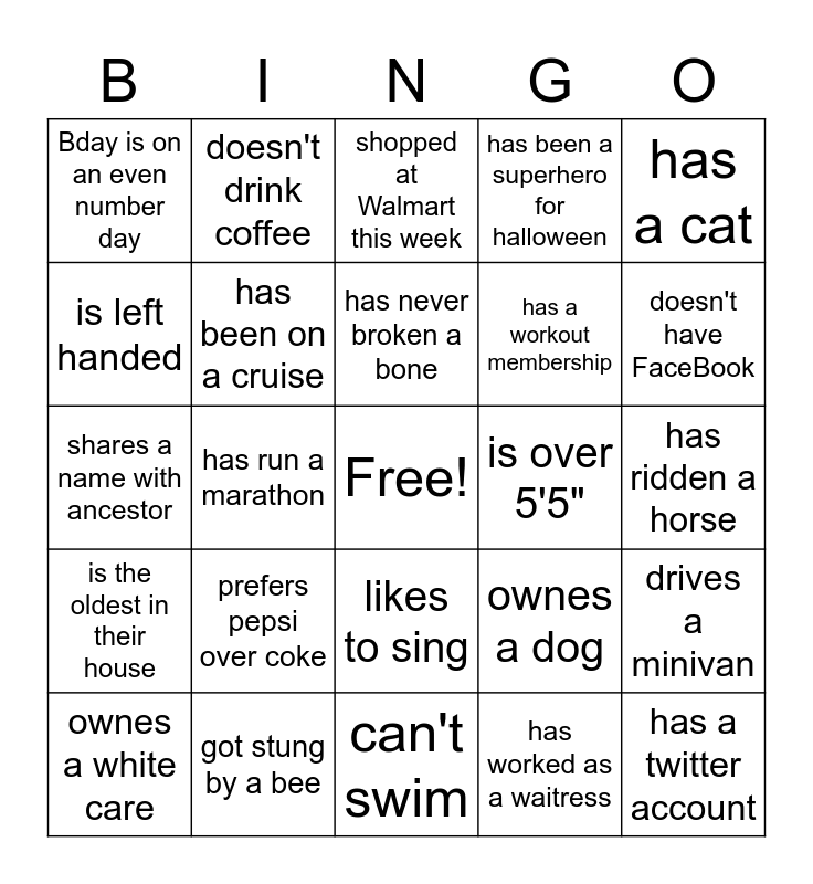 This bingo card has a free space and 24 words: prefers pepsi over coke, got stung by a bee, has never broken a bone, ownes a white care, has a cat, Bday is on an even number day, is left handed, doesn't drink coffee, is over 5'5", likes to sing, has a workout membership, shares a name with ancestor, ownes a dog, drives a minivan, has been on a cruise, has worked as a waitress, has ridden a horse, shopped at Walmart this week, doesn't have FaceBook, has run a marathon, has a twitter account, is the oldest in their house, has been a superhero for halloween and can't swim.