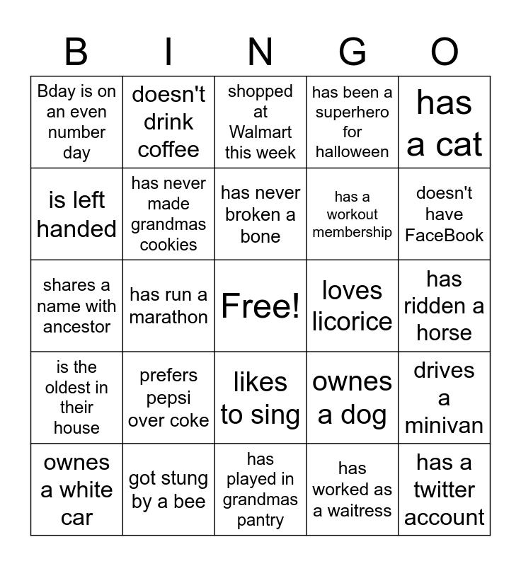 This bingo card has a free space and 24 words: prefers pepsi over coke, got stung by a bee, has never broken a bone, ownes a white car, has a cat, Bday is on an even number day, is left handed, doesn't drink coffee, loves licorice, likes to sing, has a workout membership, shares a name with ancestor, ownes a dog, drives a minivan, has never made grandmas cookies, has worked as a waitress, has ridden a horse, shopped at Walmart this week, doesn't have FaceBook, has run a marathon, has a twitter account, is the oldest in their house, has been a superhero for halloween and has played in grandmas pantry.