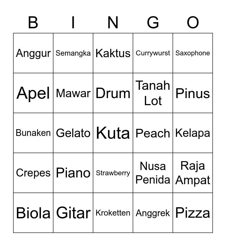 This bingo card has a free space and 24 words: Piano, Gitar, Drum, Biola, Saxophone, Anggur, Apel, Semangka, Peach, Strawberry, Tanah Lot, Bunaken, Nusa Penida, Raja Ampat, Mawar, Anggrek, Kelapa, Kaktus, Pinus, Gelato, Pizza, Crepes, Currywurst and Kroketten.