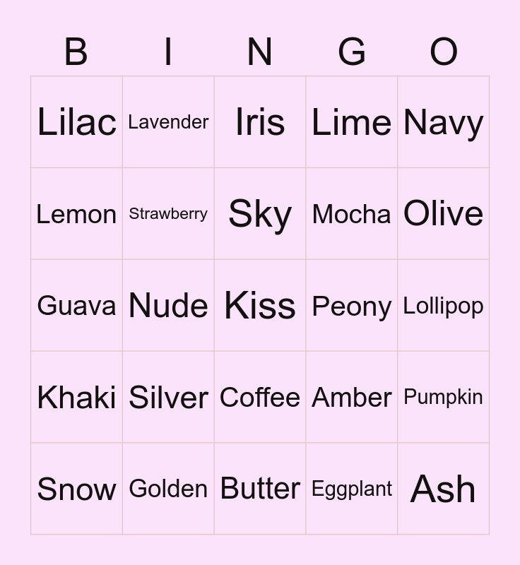 This bingo card has a free space and 24 words: Snow, Silver, Sky, Eggplant, Navy, Lilac, Lavender, Iris, Peony, Lollipop, Guava, Strawberry, Amber, Pumpkin, Lemon, Golden, Butter, Lime, Olive, Khaki, Nude, Coffee, Mocha and Ash.