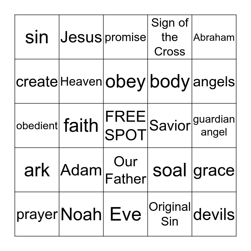 This bingo card has a free space and 24 words: Adam, Noah, obey, prayer, Abraham, sin, create, Jesus, Savior, Our Father, body, obedient, soal, grace, Heaven, Original Sin, guardian angel, promise, angels, faith, devils, ark, Sign of the Cross and Eve.