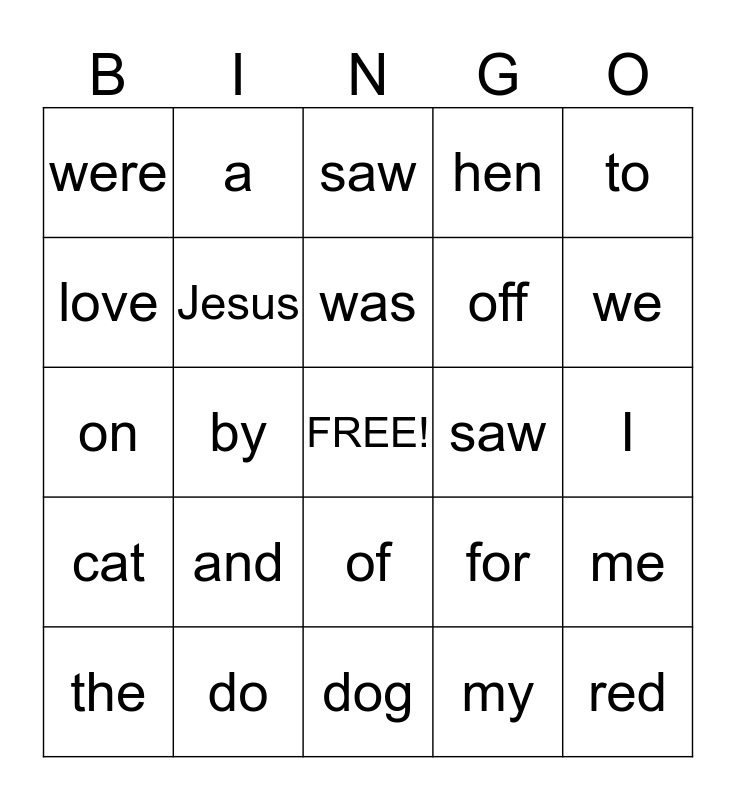 This bingo card has a free space and 24 words: and, do, was, the, to, were, love, a, saw, of, off, on, for, me, Jesus, my, I, saw, we, by, red, cat, hen and dog.