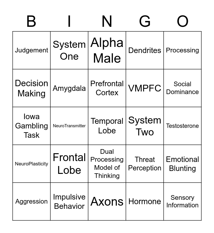 This bingo card has a free space and 24 words: Frontal Lobe, Impulsive Behavior, Prefrontal Cortex, Aggression, Processing, Judgement, Decision Making, System One, System Two, Dual Processing Model of Thinking, VMPFC, Iowa Gambling Task, Threat Perception, Emotional Blunting, Amygdala, Hormone, Testosterone, Alpha Male, Social Dominance, NeuroTransmitter, Sensory Information, NeuroPlasticity, Dendrites and Axons.