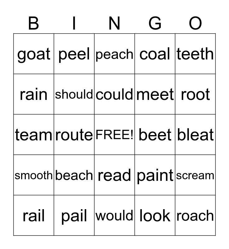 This bingo card has a free space and 24 words: beach, pail, could, rail, teeth, goat, rain, peel, beet, read, meet, team, paint, scream, should, look, bleat, peach, root, route, roach, smooth, coal and would.